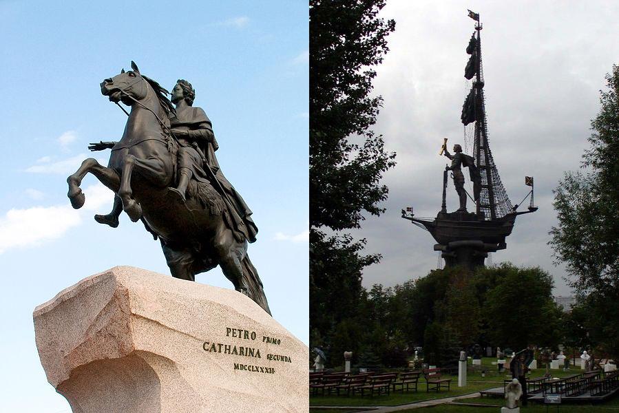 Самым первым и наиболее известным является Медный всадник в Петербурге, его изготовление и возведение заняло более 10 лет. Скульптура Петра работы Б.К. Растрелли была создана ранее Медного всадника, но установлена перед Михайловским замком позднее. Самый большой по размеру установлен в 1997 году в Москве на Москве-реке, скульптор З. Церетели.