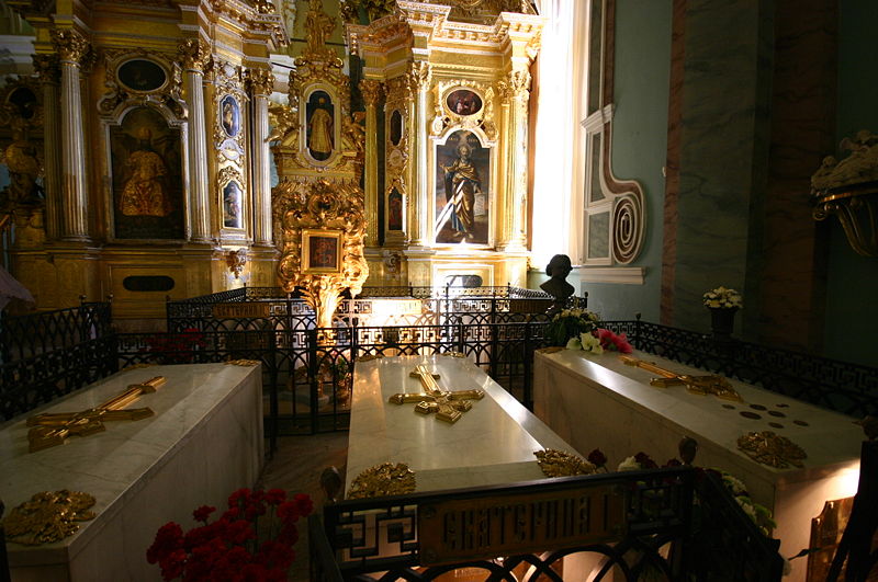 Пётр I умер 28 января 1725 года. Вдова Петра Екатерина I объявила годовой траур. Погребение было назначено на 40-ой день, в Петербурге. Для организации похорон была создана «Печальная комиссия» во главе с Яковом Брюсом, которая должна сделать все, чтобы похороны царя стали государственным событием. За образец Яков Брюс взял разработанную самим царём в 1699 году церемонию похорон Франца Лефорта. 30 января тело Петра 1, предварительно вскрытое и забальзамированное, было выставлено для прощания в «Меньшей дворцовой зале». 13 февраля оно было перенесено в приготовленную за эти дни «Печальную залу», где находилось вплоть до погребения. 10 марта 1725 года начался перенос тел Петра I и его 6-летней дочери Натальи, умершей в начале марта, в Петропавловский собор. Далее тела символически были «преданы земле» (посыпаны землей), гробы закрыты, на них разостлали императорские мантии и оставили на катафалке под балдахином на 6 лет. 16 мая 1727 года рядом с телом Петра выставлен гроб скончавшейся Екатерины. 21 мая 1731 года, по указу императрицы Анны Иоанновны, было совершено погребение Петра и Екатерины. Их хоронили в золотых коронах, в герметично закрытых гробах. Как и при похоронах московских царей, могилы не засыпали землёй, а закрыли плитами.
