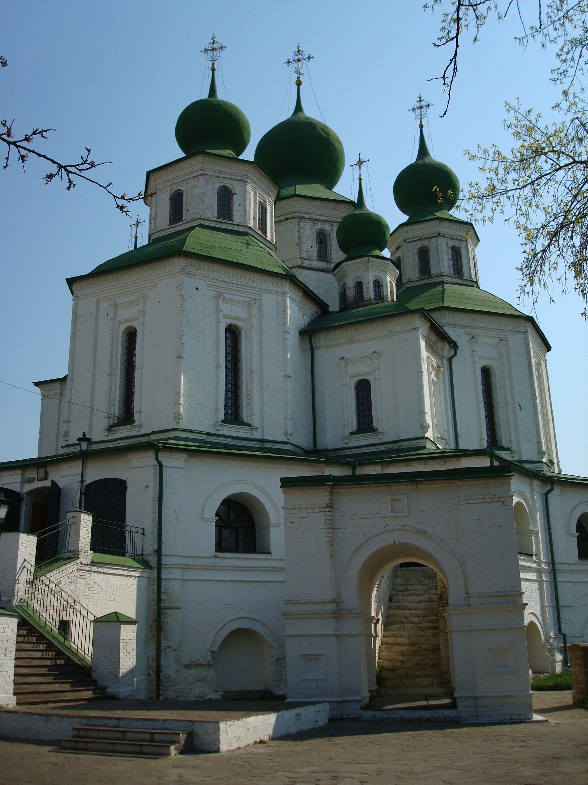 // |  |  История этого каменного девятиглавого храма, высотой 46 метров, интересным образом связана с именем Петра I. Храм был выстроен неизвестным архитектором в стиле украинского барокко во время действия указа Петра I о запрете строительства каменных зданий везде, кроме Петербурга. Однако, сам Пётр I содействовал строительству Воскресенского войскового собора в Черкасск. Не только помогал деньгами, утварью, специалистам, но и лично приняв символическое участие в строительстве. Собор окружен двухярусной галереей — гульбищем, визуально связавшей его с архитектурой казачих куреней Черкасска. Интерьер собора поражает своим убранством, находящимся в контрасте со сдержанным внешним видом. Уникальный пятиярусный позолоченный резной иконостас размером 19×23 метра содержит в себе 149 икон. Из необычных деталей привлекают внимание металлические плиты перед алтарём, где находятся отлитые надписи о том, что на этом месте в своё время молились русские императоры и великие князья. А при входе в храм на стене висят массивные кандалы и цепи, в которые был якобы закован Степан Разин перед отправкой на казнь. В галерее, за металлической плитой, находится прах войскового атамана Кирилла Яковлева, который предательски выдал своего крестного сына Степана царскому правительству. Редактор-арбитр Наталья Быкова