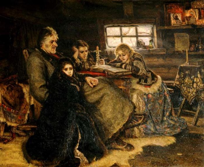 Картина Василия Сурикова «Меньшиков в Березове». Холст, масло. Замысел картины «Меншиков в Березове» появился в деревне Перерве под Москвой, куда семья живописца выехала на лето. Они сняли крохотную избушку без печки, с низким потолком и маленькими окошками. Погода была дождливой и холодной, все семейство постоянно сидело дома, кутаясь в платки и шубы. Однажды, оглядев домочадцев, собравшихся у стола, Суриков вдруг понял, что вот так же когда-то сидел любимец и ближайший сподвижник Петра I — светлейший князь Александр Данилович Меншиков, после смерти своего государя сосланный с семьей умирать в холодный сибирский городок Березов.