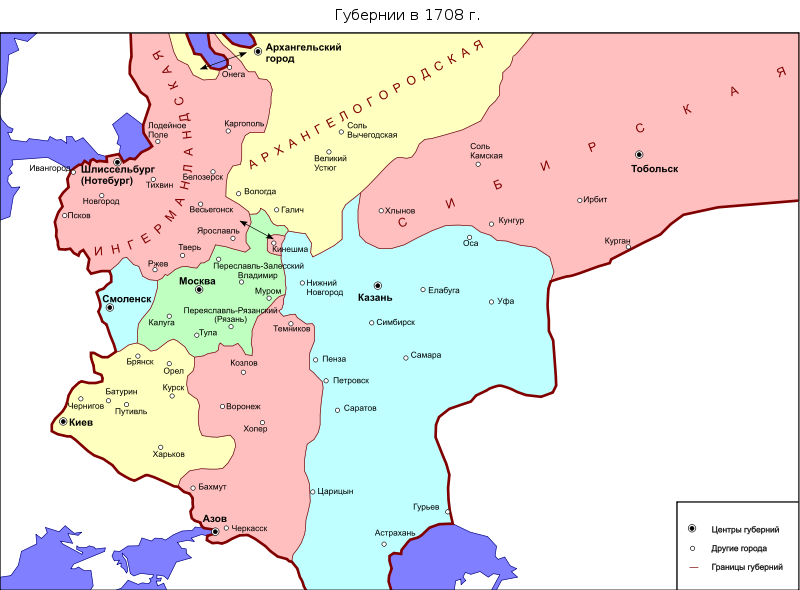 Губернская реформа 17 декабря 1708 г. является важной составной частью преобразований Петра I в России, которая получила различные оценки в исторической литературе. Они касаются не только определения целей и задач Петра I в сфере государственного управления, но и проблем ее практического осуществления и результатов. Данную реформу можно охарактеризовать следующим образом: в 1708 году, чуя хронический дефицит и не полагаясь на устарелое приказное управление, Петр искал выход в децентрализации и переместил казенные палаты из центра в губернии, но малая удача нового порядка (прежде всего, плохая собираемость налогов) заставила его думать о повороте назад к центру.