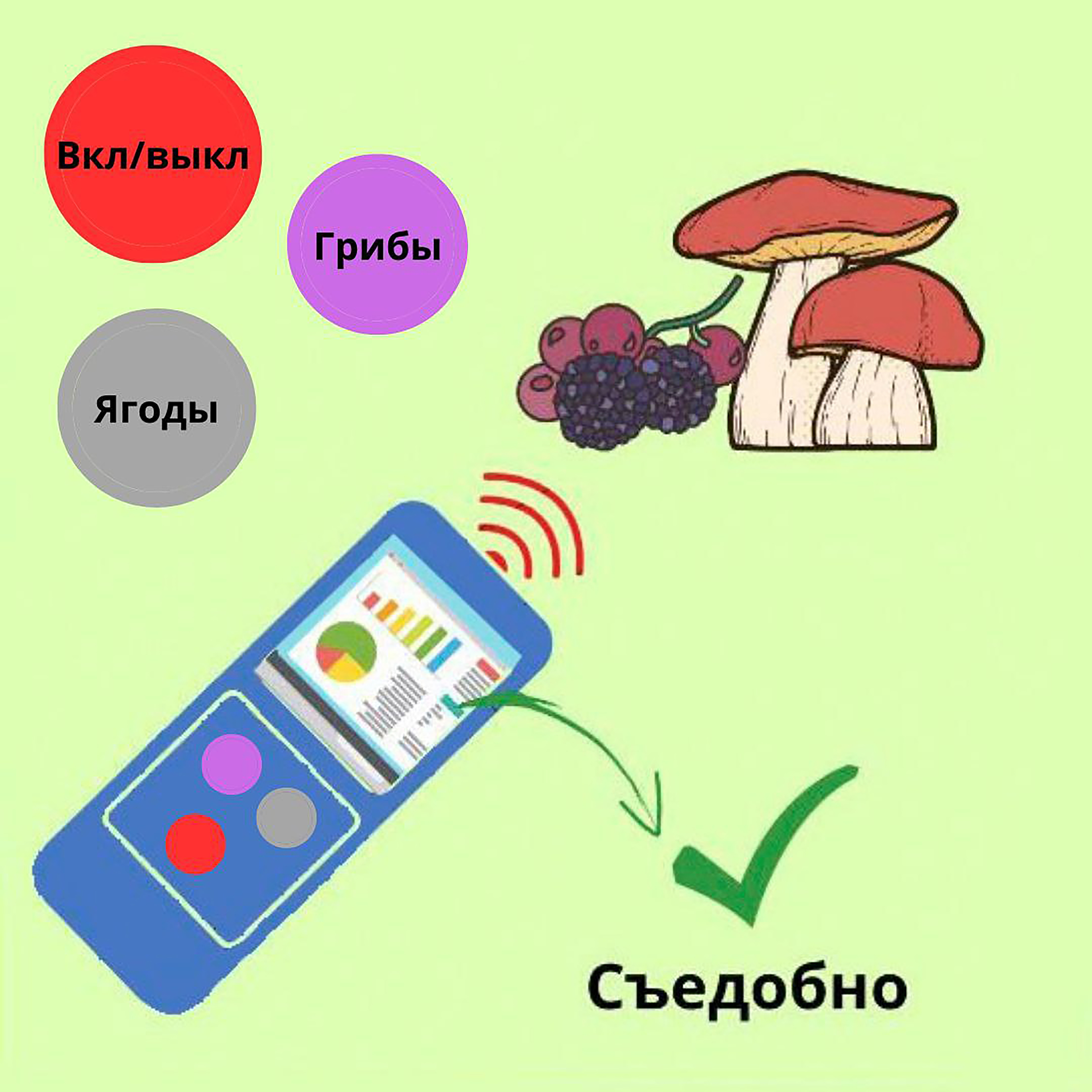 Это абсолютно невесомый, что очень важно для туристов и путешественников, прибор. Всего 30гр — и вы даже не ощутите его у себя в кармане. Прибор представляет собой небольшое устройство с дисплеем. На приборе находятся всего три кнопки: ягоды, грибы, вкл/выкл, поэтому разобраться в его функциях не составит труда ни ребенку, ни пожилому человеку. Работает от батареек, а так же от солнечного света. Продолжительность работы без подзарядки — 7 суток. Этого вполне хватит, чтобы ходить на дальние расстояния. Поднося прибор к неизвестному грибу или ягоде, происходит сканирование и считывание всех параметров объекта и через три секунды выдается точный результат — название, вид, род, на экран выводятся данные о питательности, а самое главное, об опасности продукта. Даже опытные грибники иногда сомневаются в происхождении и названии своей добычи. Не рискуйте! Пользуйтесь Грибоядкой универсальной и будьте спокойны за свое здоровье и за жизнь своих родных. Продается в садоводческих магазинах. Остерегайтесь подделки.