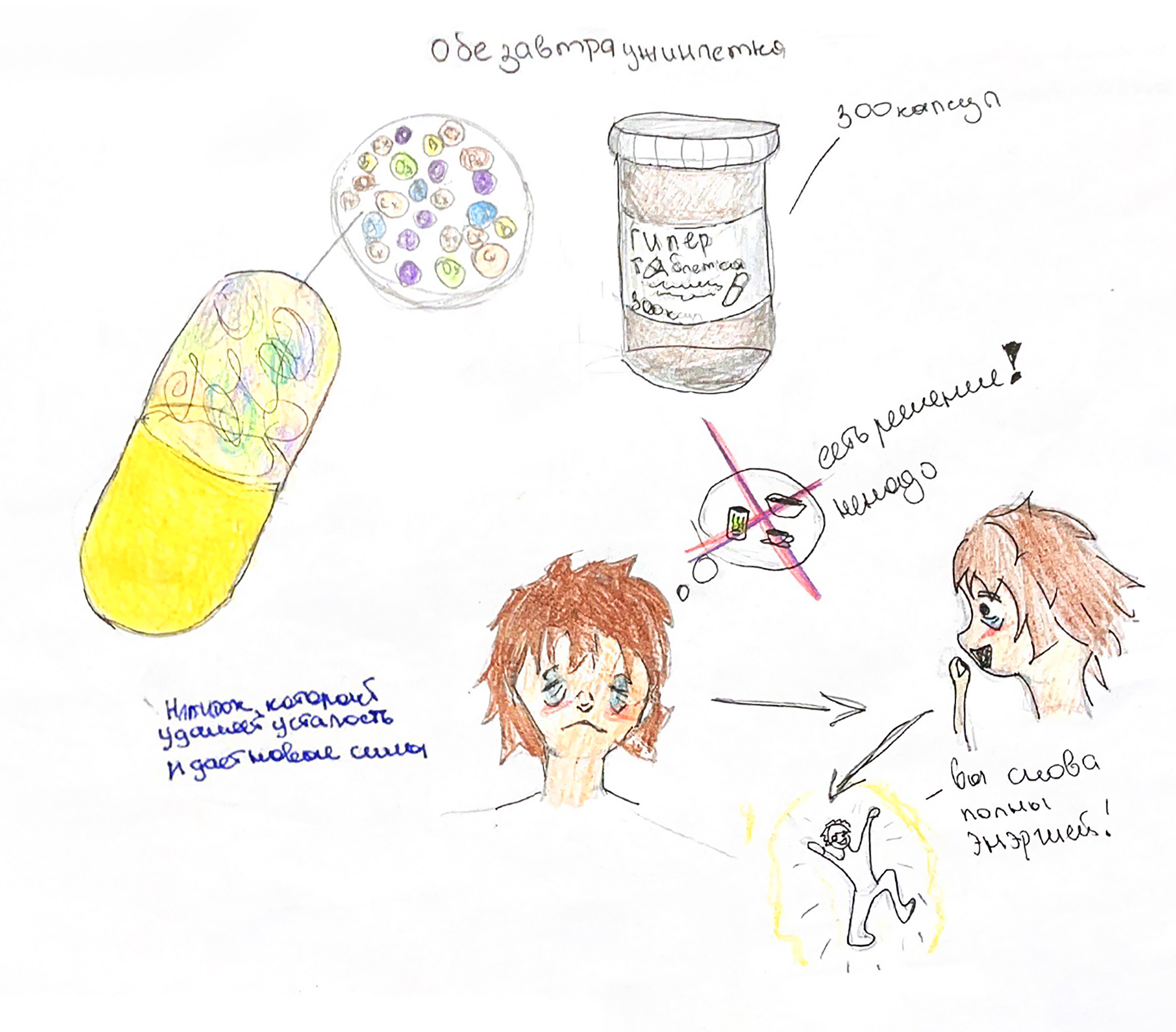 Если вы не выспались и опаздываете на работу или приехали с нее и чувствуете усталость, но желаете травить себя кофейными напитками, то решение есть — гипер-таблетка. Выпейте эту таблетку с любым напитком, и вы не только утолите голод и усталость, но и напитаетесь важнейшими витаминами.