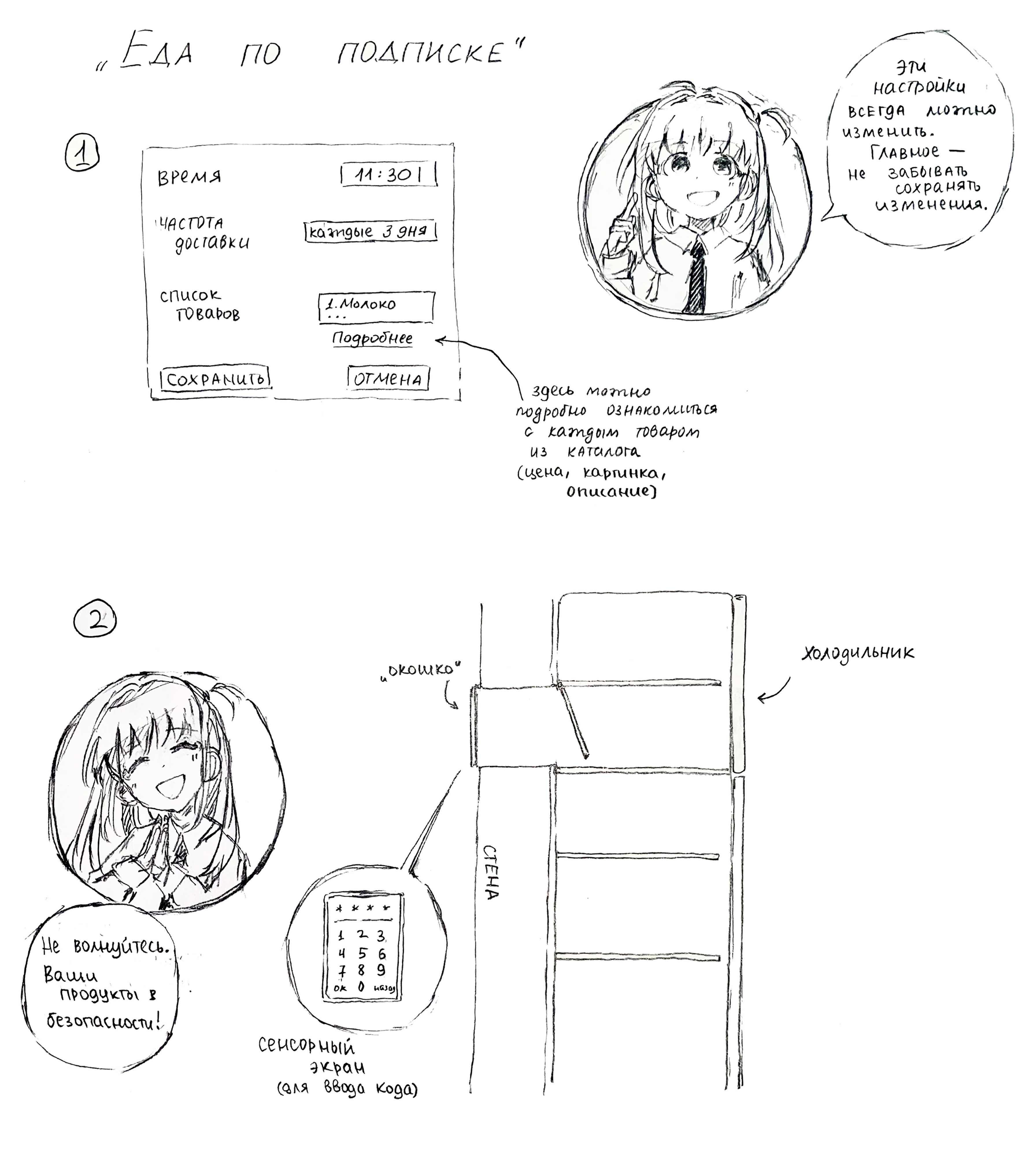 Вторая часть изобретения — доставка. Рядом со стеной, контактирующей с окружающей средой, устанавливается холодильник. В его задней стенке открывается проход, ведущий сквозь стену наружу: получается «окошко», через которое курьер может положить заказ прямо в холодильник. В целях безопасности курьер каждый раз получает четырёхзначный код, который должен будет ввести на маленьком сенсорном экране, чтобы «окошко» открылось. Таким образом, доставка сможет осуществляться в указанное время, даже если заказчика нет дома. В наше время доставки и маркетплейсы находятся на пике популярности и продолжают активно развиваться. И хотя «Еда по подписке» не является жизненно необходимым изобретением, есть вероятность, что в ближайшем будущем оно станет таким же реальным, как и обычная доставка.
