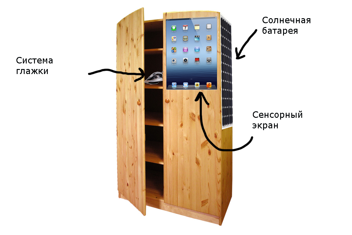 Состоит из: 1) системы рельс и конвейеров, по которым буду перемещаться вещи; 2) системы глажки и химической чистки вещей; 3) солнечных батарей; 4) системы аккумуляторов; 5) сенсорного меню; 6) деревянного корпуса; 7) системы сенсоров.
