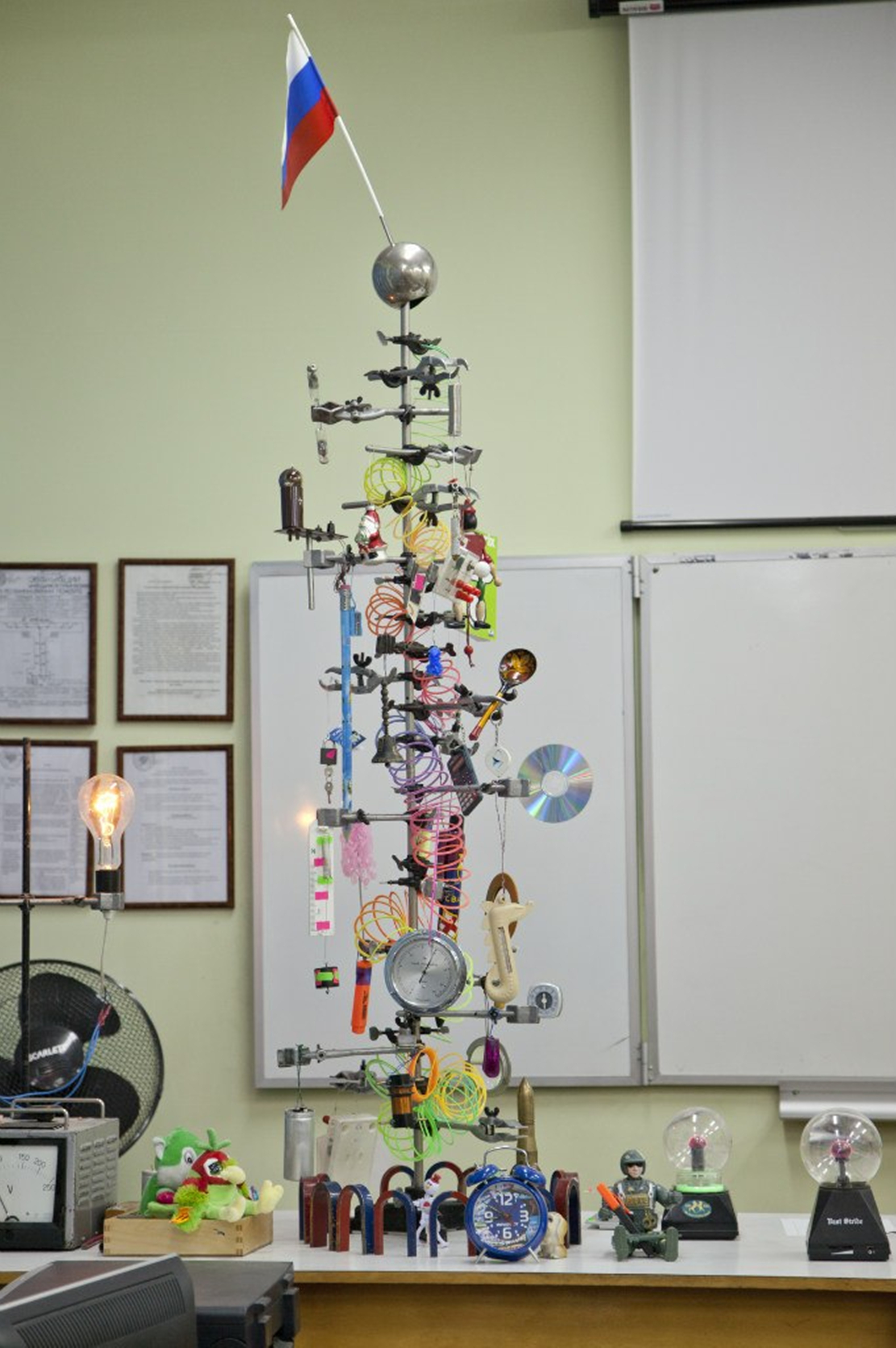 Собирается очень легко, выглядит оригинально. Основа — штатив, лапки, на которые крепятся все предметы, нужные для жизни: конфеты, мультиметр, диски, будильник, учебники, можно даже одежду повесить — все что душе угодно! Такая вещь должна быть в каждом доме обязательно!