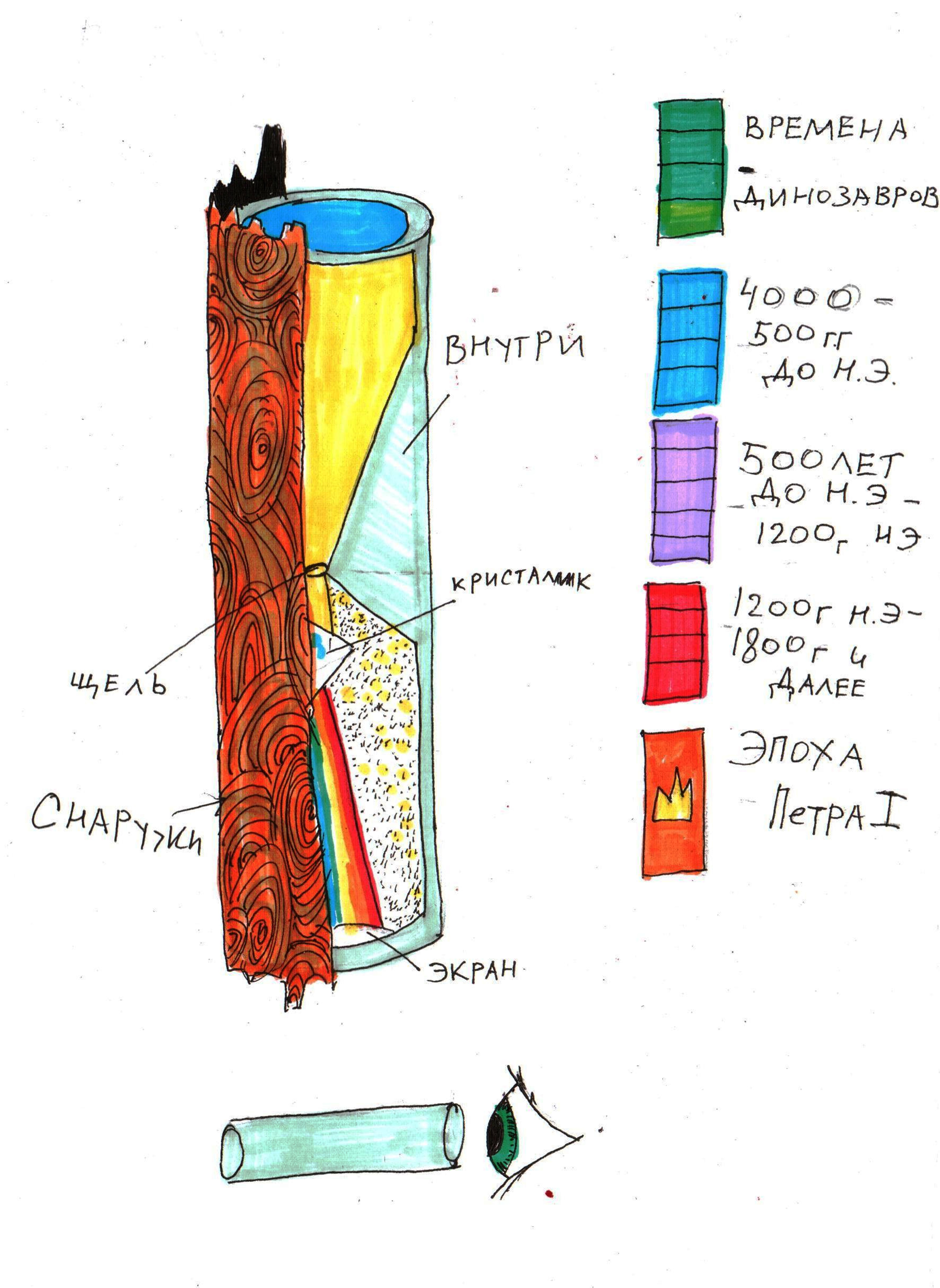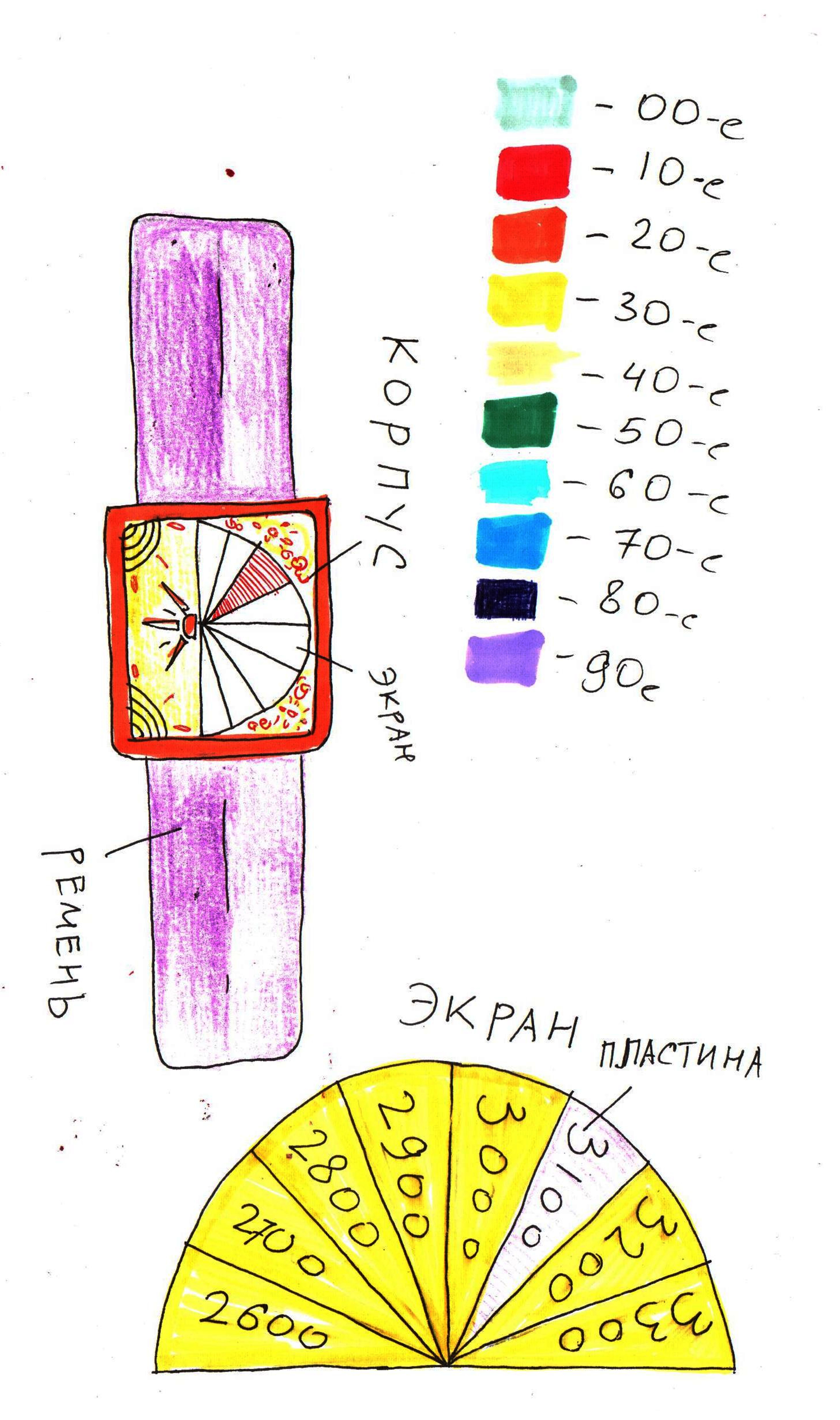 Как же оно работает? Очень просто. Ментальные фильтры, установленные по всей планете, здесь почти не чистятся (ведь это никак не вредит окружающей среде), и потому скапливается много мысленного мусора. Именно эту загрязненность и измеряет «временатор». К его шкале подведены диоды. Диод определенного века зажигается определенным цветом, зависящим еще и от десятилетия (как указано на картинке).