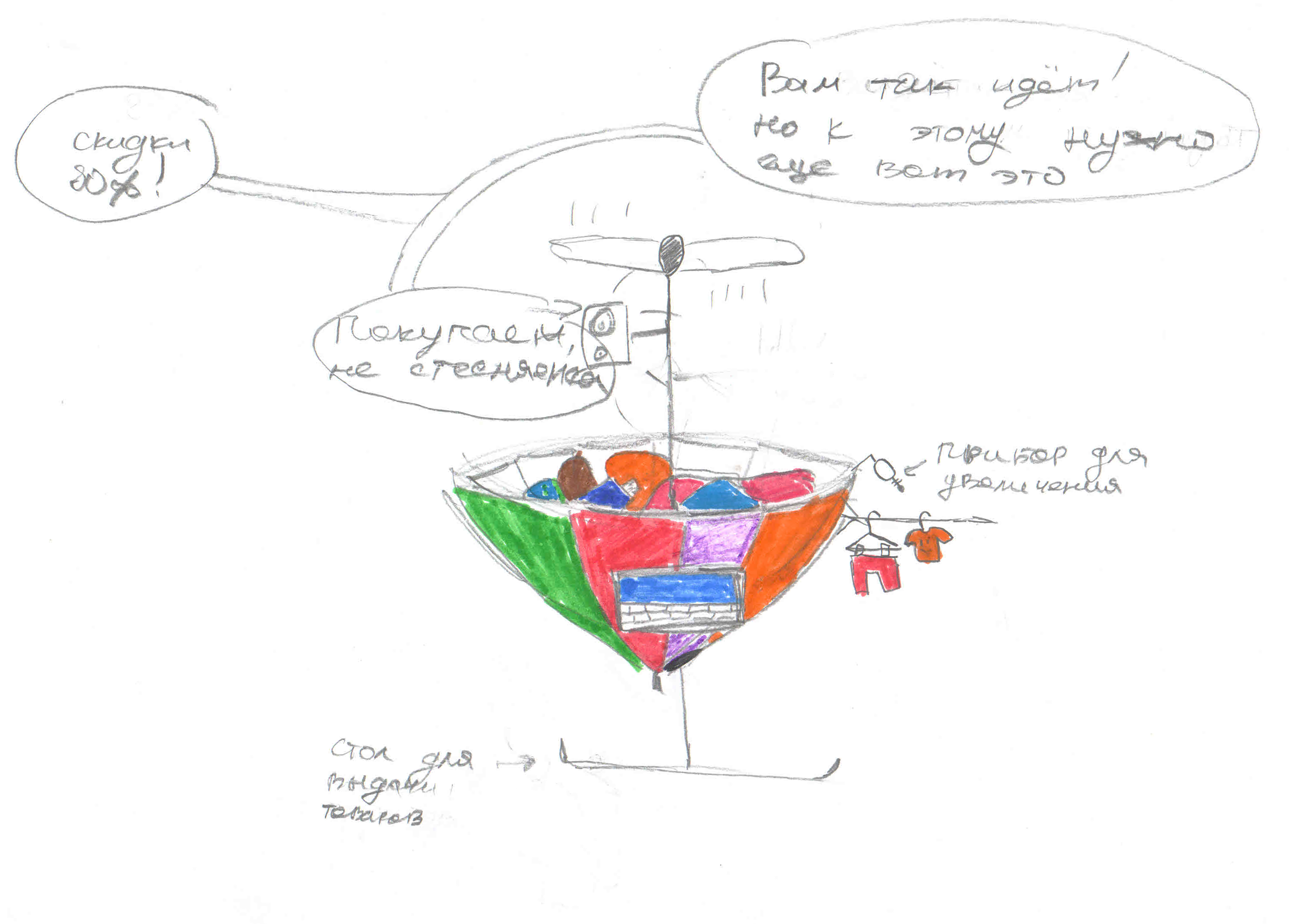 Зонтбот специально создан для магазинов. Это консультант-робот. Он летает за покупателем, предлагает свои услуги. Если вы что-то не можете найти — введите его название, и он выдаст его на столике.
