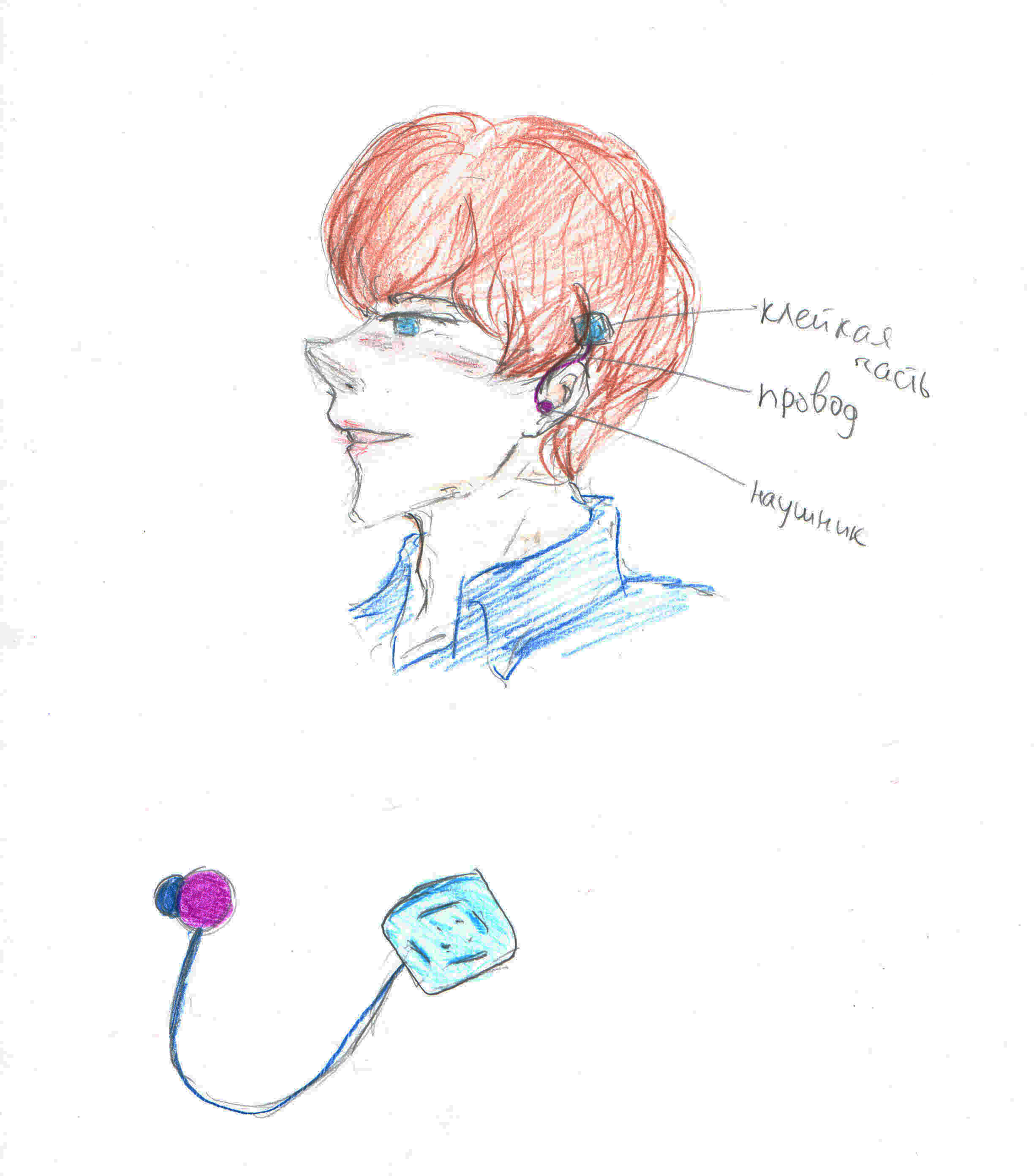 Наш аппарат называется «Уховед-1». Суть этого приспособления заключается в том, чтобы выдавать правильный ответ на любой вопрос. Состоит он из маленького наушника размером с горошину, который вставляется в ушную раковину, провода и клейкой части, которая присоединяется к виску, и через которую информация из мозга поступает в прибор. С помощью встроенного искусственного интеллекта аппарат анализирует вопрос, появившийся в ваших мыслях, и выдаёт ответ, который человек слышит через наушник. Прибор скрыт за волосами.