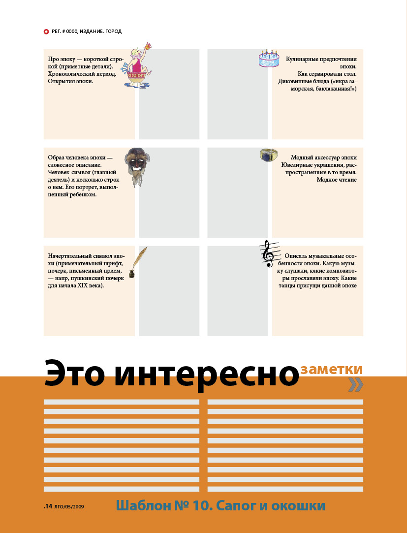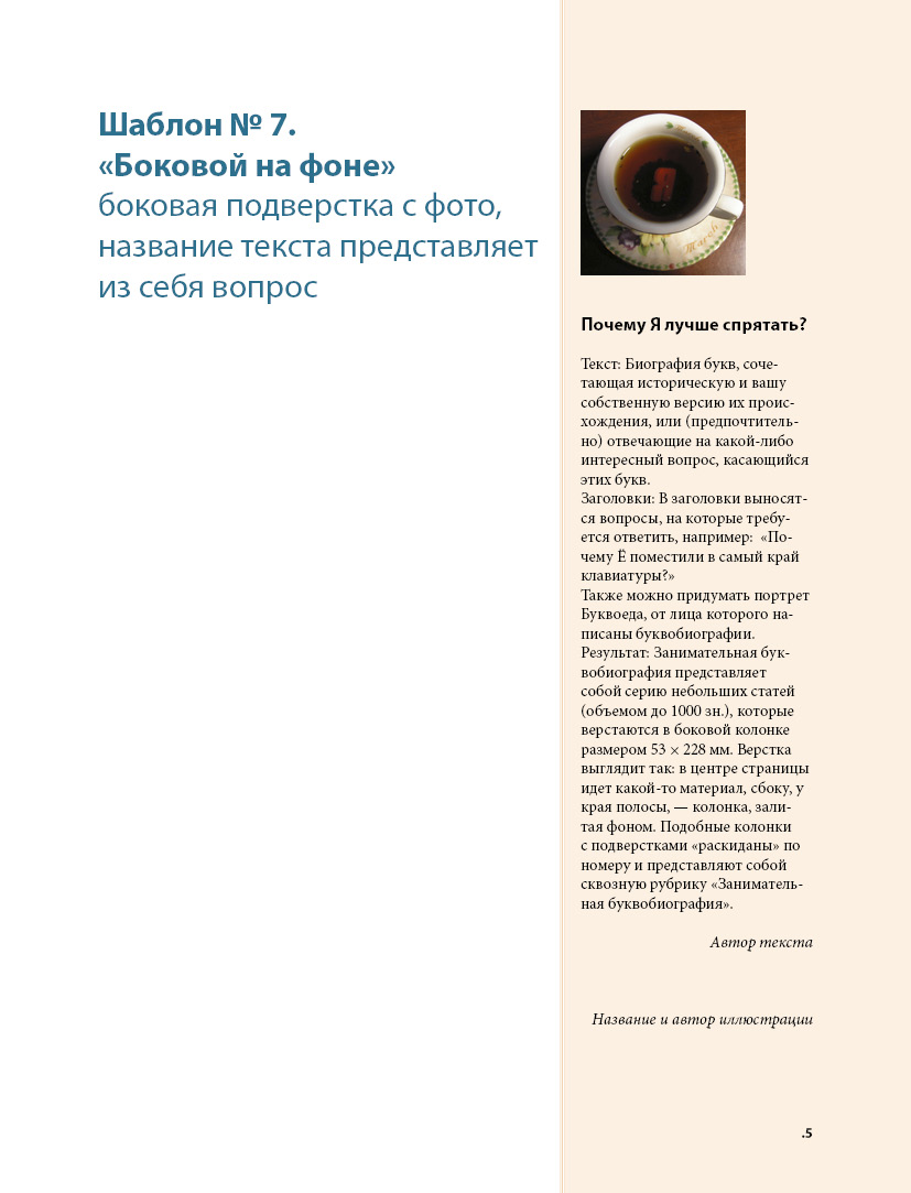 Задание: Придумать собственные невероятные истории про происхождение букв. Тексты: Создать биографии букв — вашу собственную версию их происхождения, или (предпочтительно) ответить на какой-либо интересный вопрос, касающийся этих букв. Объем одного текста: 1200 зн. Заголовки: В них выносятся вопросы, на которые требуется ответить, например: «Почему Ё поместили в самый край клавиатуры?» Очень желательно набрать не похожие друг на друга и не «заезженные» вопросы. Картинки: Придумать идеи для иллюстраций, которые косвенно, но с выдумкой показывают суть буквы (крупный, рослый парень, бьющий себя в грудь кулаком: «ЯЯЯ!» Компас, где выделено слово «Юг»). Верстка: Занимательная буквобиография представляет собой серию небольших статей (объемом до 1000 зн.), которые верстаются в боковой колонке. Верстка выглядит так: в центре страницы идет какой-то материал, сбоку, у края полосы — колонка, залитая фоном. Подобные колонки с подверстками «раскиданы» по номеру и представляют собой сквозную рубрику «Занимательная буквобиография».