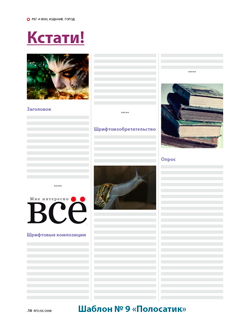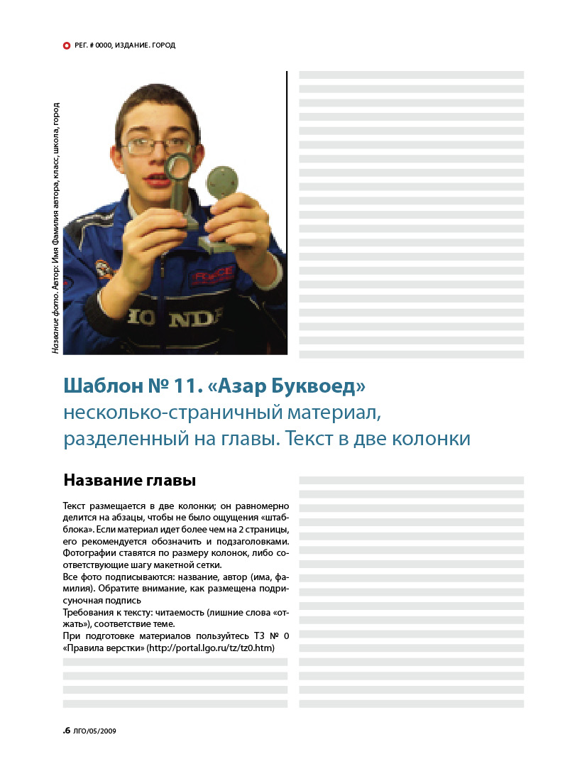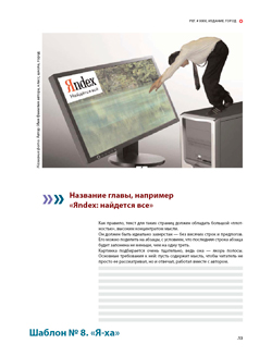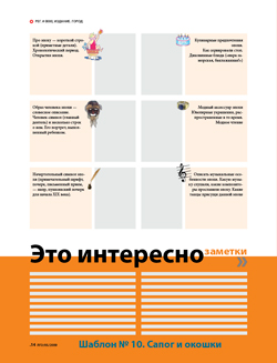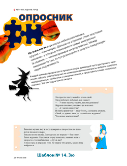 Задание: Раньше буквы имели названия: А — аз, Б — буки, В — веди, Г — глаголь, Д — добро. Отсюда произошли их репутации. Сами буквы связывались с понятиями и обретали как бы свой «призрак»: говоришь «земля», и кроме почвы возникает еще и буква З. Эти «названия-призраки» букв давно утратились. Зато за многими из букв закрепились другие, современные «призраки». Например, М — метро, Я — Яндекс, «М и Ж» — ну, понятно…. Текст: Короткие статьи-заметки о каждом из найденных «призраков» — не надо много, достаточно выбрать самые интересные, характерные или забавные и обратить внимание на феномен: как буква алфавита приобретает в современности самостоятельное, отдельное звучание. Заголовки: Отталкиваются от понятий, с которыми ассоциируются буквы (например, «Яндекс: найдется все»). Картинки: Фотографии, фотоколлажи или рисунки, отражающие современные «параллельные» значения букв. Верстка: «Буквы и их призраки» — это многостраничный материал, разделенный, как роман, на главы. Верстка выглядит так: текст в две колонки. Одна крупная иллюстрация. На развороте могут стоять несколько глав. |