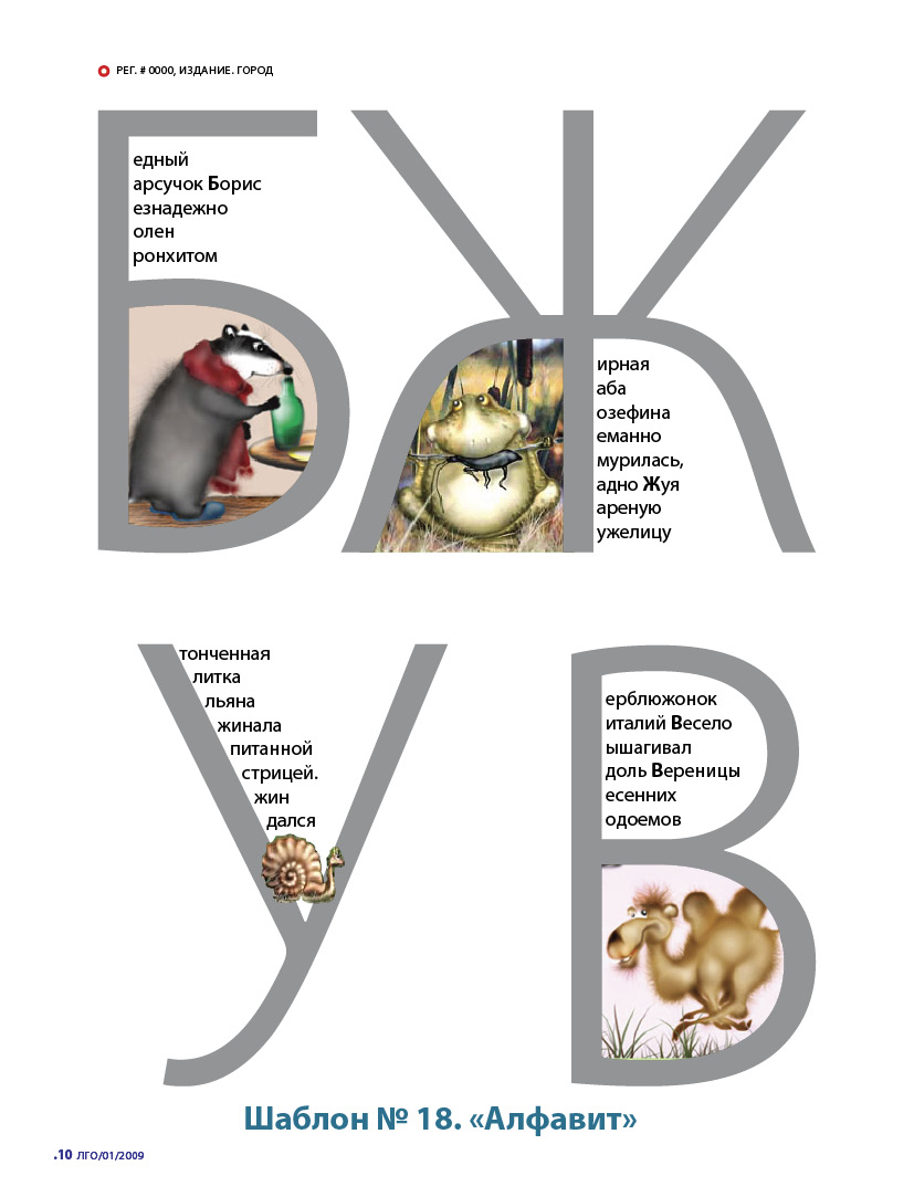 Задание: Приглядитесь к буквам алфавита — у каждой свой характер. Может быть, вы и сами давно это заметили, только не было случая рассказать. Вот и представьте, что алфавит — это класс. Опишите портрет, характер, пристрастия каждой буквы-ученика, их «взаимоотношения». Придумайте какую-нибудь историю из жизни такого «класса». Конечно, речь не о фантазировании «от фонаря», а о восприятии графического образа (остроугольность, округлость, ширина, обозначаемые звуки), — то, что порождает аналогии с людьми. Тексты: Каждая буква представляется небольшой (на 2–3 строчки) заметкой и фото, которому дается «говорящее название». Заголовки: По названию буквы (А — арка). Картинки: По которым ясно можно угадать, какая буква на них представлена. Верстка: «Очеловеченная» азбука, на одной полосе — 9 букв. |