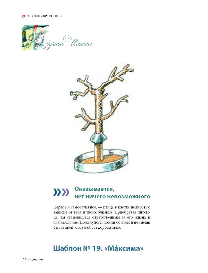 Задача: Сравните, к примеру, азбуку начала прошлого века и, допустим, его середины или конца. Для каждого нового поколения грамотеев алфавитные рисунки менялись, ведь менялись и вещи, их окружающие. А как выглядела бы азбука для современных малышей? Какие картинки вы предложили бы? Как бы оформили комплекс «буква — картинка»? А если еще и с улыбкой? А если еще и такая же азбука для тинейджеров? Тут уж точно юмор будет главным средством. Можно и для взрослых свою азбуку создать, и не только с рисунками, но и с небольшими сопроводительными текстами. Текст: Стихи, этюдики, набор слоганов, отражающих мир тех адресатов, которые выбраны авторами. Адресат азбуки — по выбору создателей (для малышей, тинейджеров, взрослых; для спортсмена, для компьютерного аса, для книгочея, др. варианты). Заголовки: Буквы. Картинки: Показать на рисунках что-то очень знакомое, чтобы буква четко вязалась с изображением. Верстка: На странице — 4 крупные буквы. В них «вписан» текст. Вариант. В левом поле — рисунок, иллюстрирующий букву, с самой буквой (как во всякой азбуке), в правом — текст. Следующий фрагмент — наоборот. Если рисунки выполнить отчетливо, то их можно уменьшить и заверстать подряд, и тогда на полосе уместится вся «азбука» (как во всяком букваре). При этом, конечно, нет задачи проиллюстрировать все буквы алфавита. |
