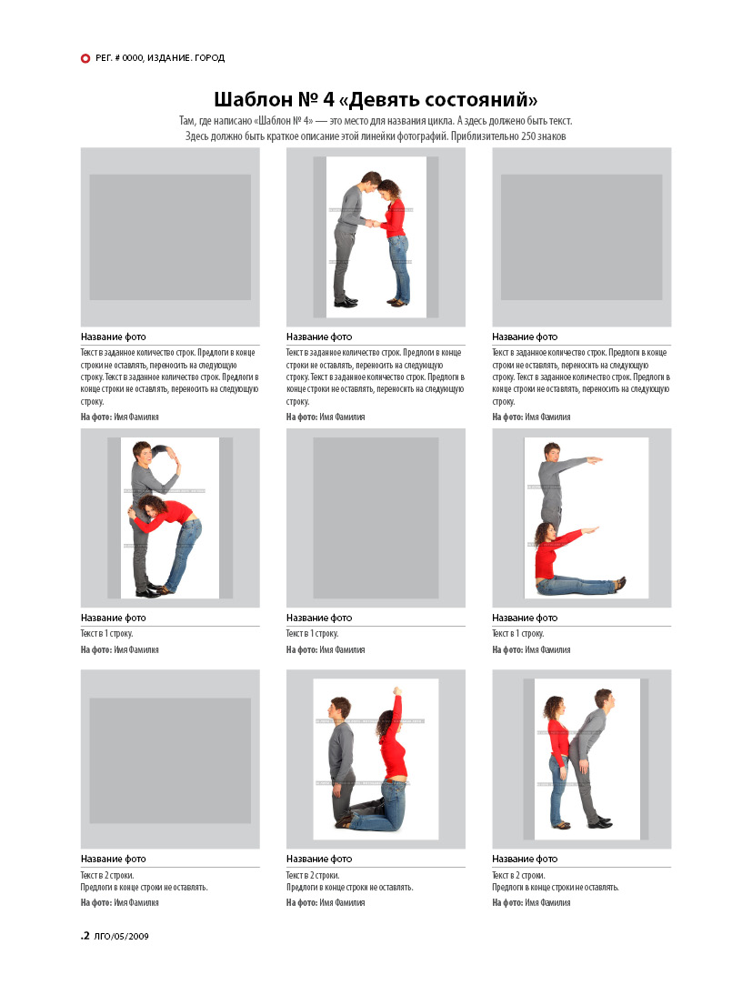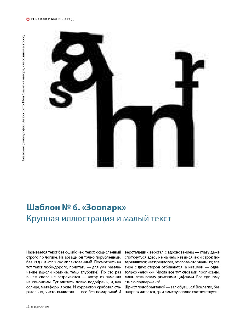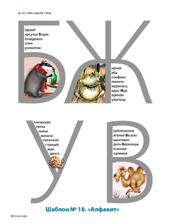 Задание: Показать превращения букв в животных. Заголовки: Сделать к рисункам парадоксальные подписи (например, «Однажды обыкновенное облако вообразило, что оно корова»). Они и будут заголовками. Тексты: К каждому существу дается маленький рассказик. Картинки: Нарисовать существа, состоящие из букв. Верстка: выглядит так: одна полоса — одно существо. Текст верстается под рисунком. Возможно также использовать шаблон № 4 «Девять состояний». |