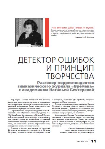 Интервью с Натальей Бехтеревой, по заданию ЛГО его когда-то делали спецкоры исторического журнала «Времена» (Спб).